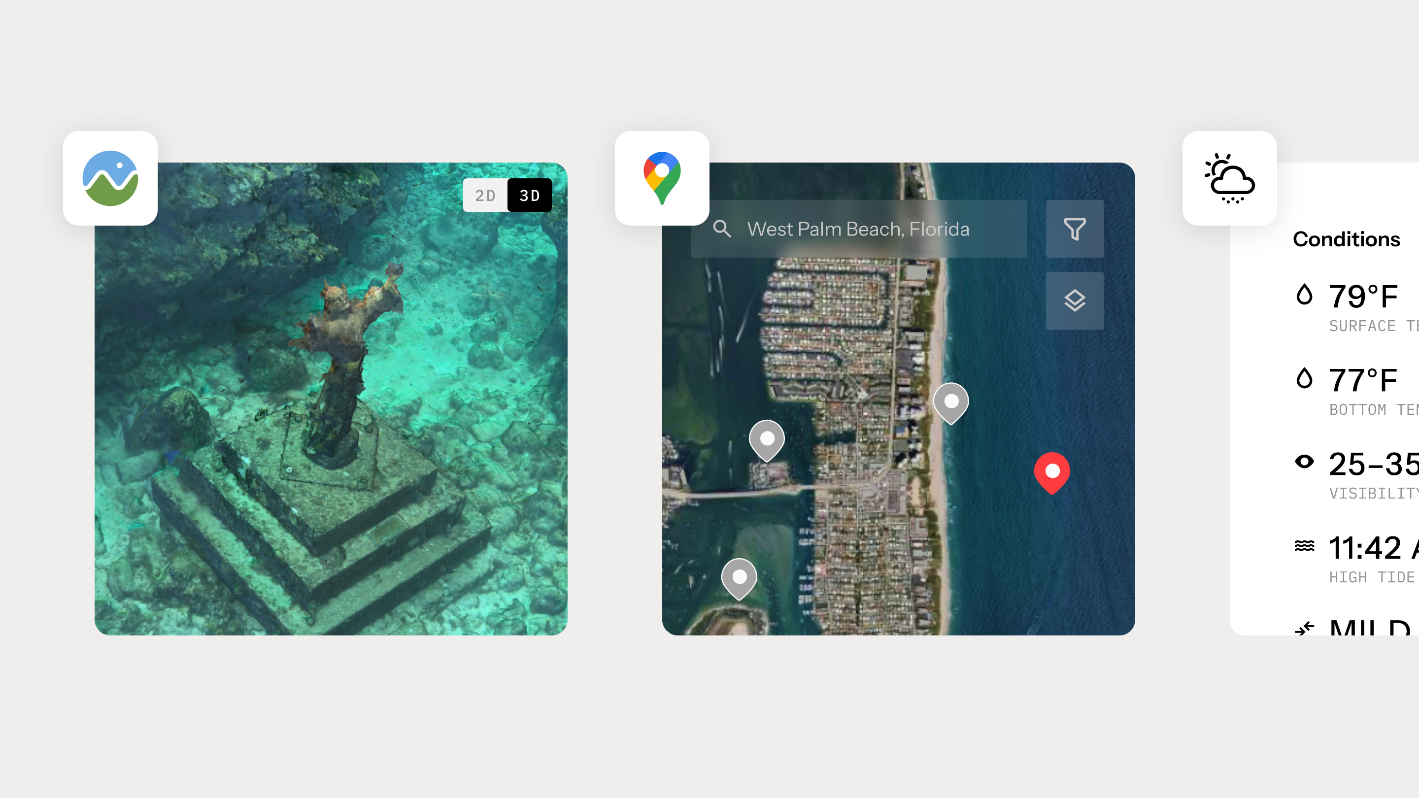 The app itself came with a set of non-trivial requirements. It needed to support 3D underwater maps showing real topography that users could rotate and explore. It required interactive surface maps with custom pins, clustering, and route drawing. Live weather data had to be tied to specific dive locations. On top of that, the system needed a functioning database to support waypoints, dive plans, and early social features.