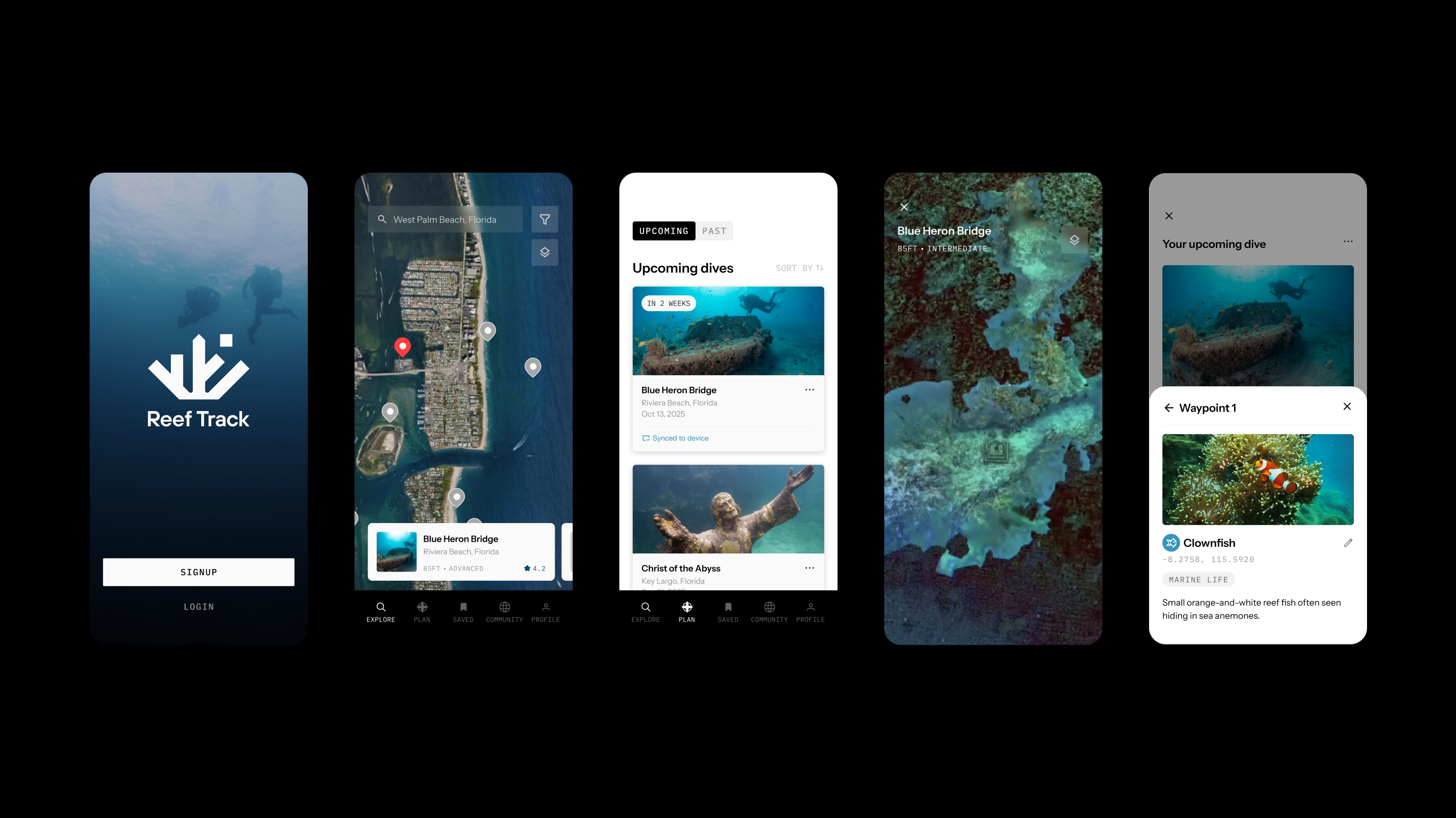 The Reef Track app was designed to consolidate dive planning, site research, and community insight into a single, intuitive experience. Divers can explore dive sites, review real-time conditions and hazards, design routes, mark points of interest, preview dives ahead of time, and sync plans directly to the wrist device.