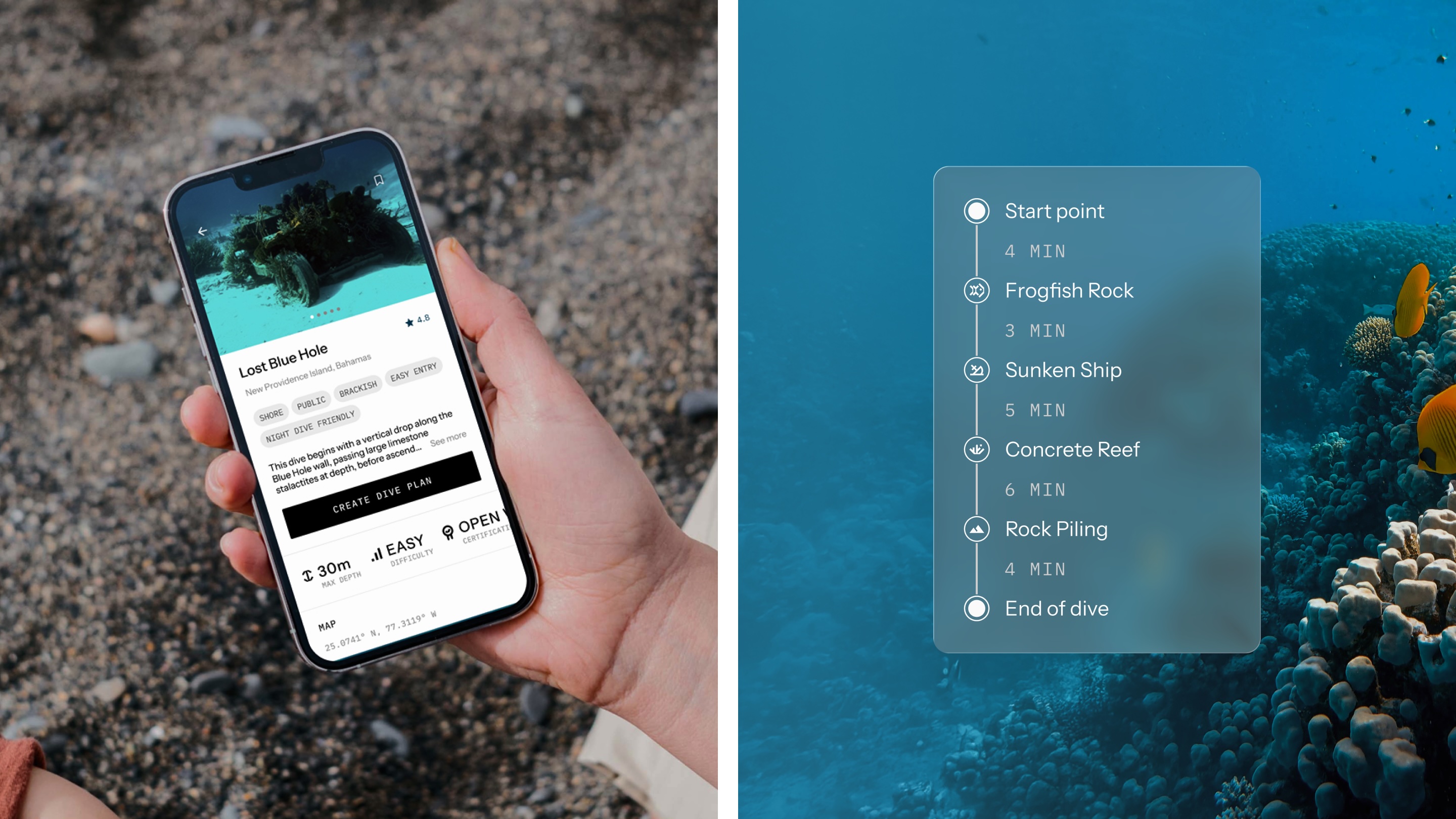 We partnered with Reef Track to create a first-of-its-kind platform designed for underwater navigation. Even the most experienced divers can experience moments of disorientation below the surface, undermining confidence and pulling attention away from the dive itself. Reef Track addresses this core challenge by instilling clarity and trust at every stage of the experience, from pre-dive planning to in-water navigation and post-dive reflection.