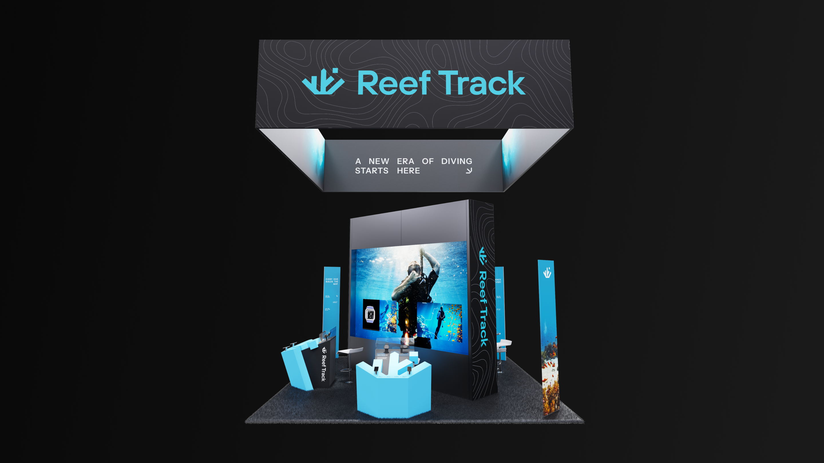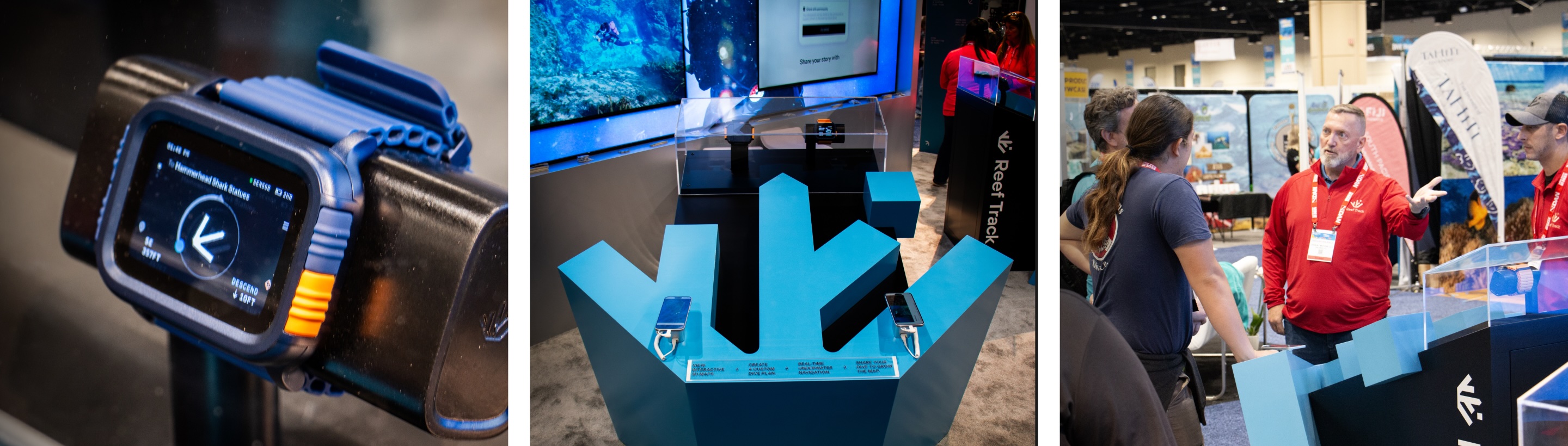 Launching a first-of-its-kind navigation platform at the DEMA (Diving Equipment and Marketing Association) conference required making a complex navigation system immediately understandable on the show floor. The booth design used eye-catching visuals, clear language, and a carefully choreographed flow through the space to guide visitors through all the touch points that create the Reef Track experience.