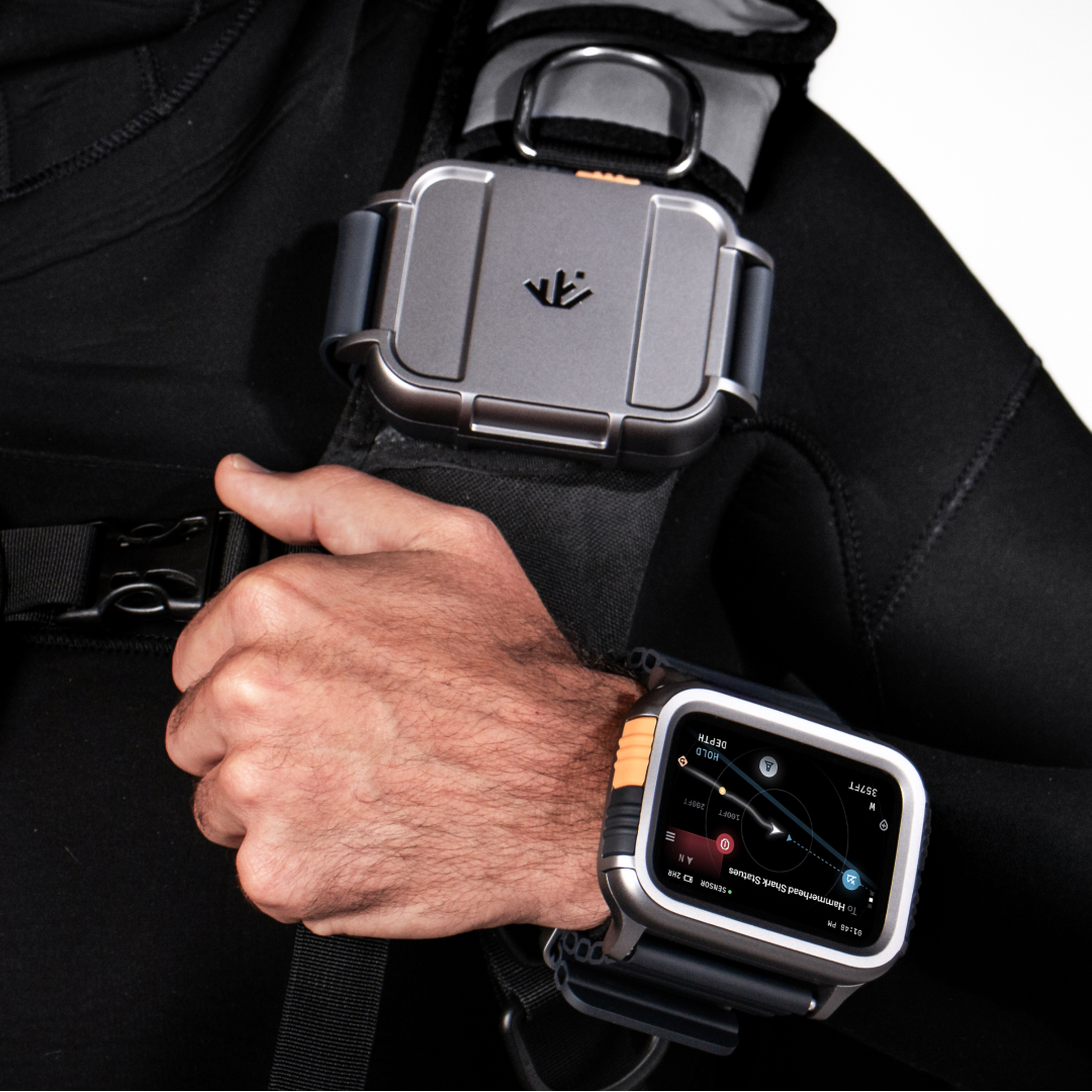 The wrist display is paired with a durable, water-resistant silicone band built to withstand saltwater, movement, and extended wear. Core motion sensing is handled by a precision IMU mounted to the diver’s vest, keeping tracking stable while allowing the wrist display to remain lightweight and unobtrusive.